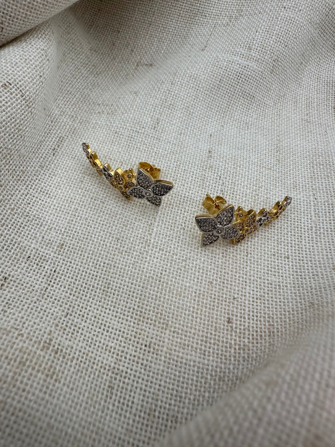 Our delicate Ana flower ear climbers with sparkling stones and 18K gold plating over brass. These lightweight climbers curve naturally along the ear, adding a soft, feminine touch without feeling too dressy. Easy to wear and perfect for layering with small studs.