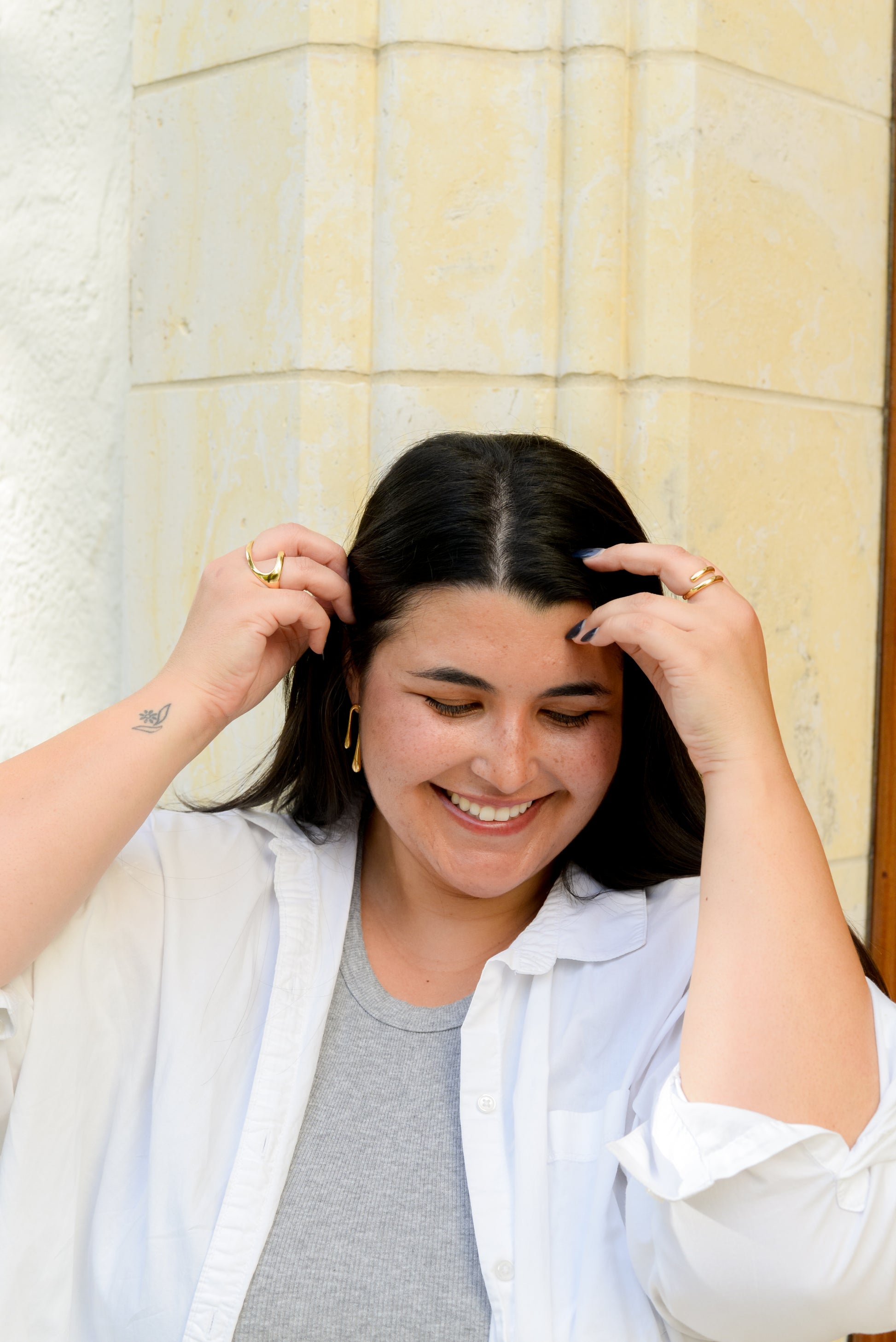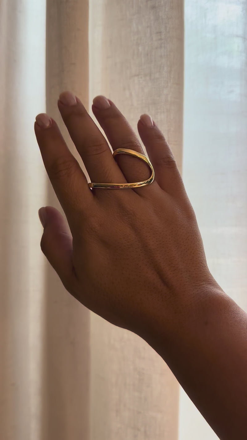 Bold and stylish, the Ariana Two Finger Ring adds a unique twist to your look. 18k heavy gold plating over brass and fully adjustable. Hypoallergenic. One size fits most.